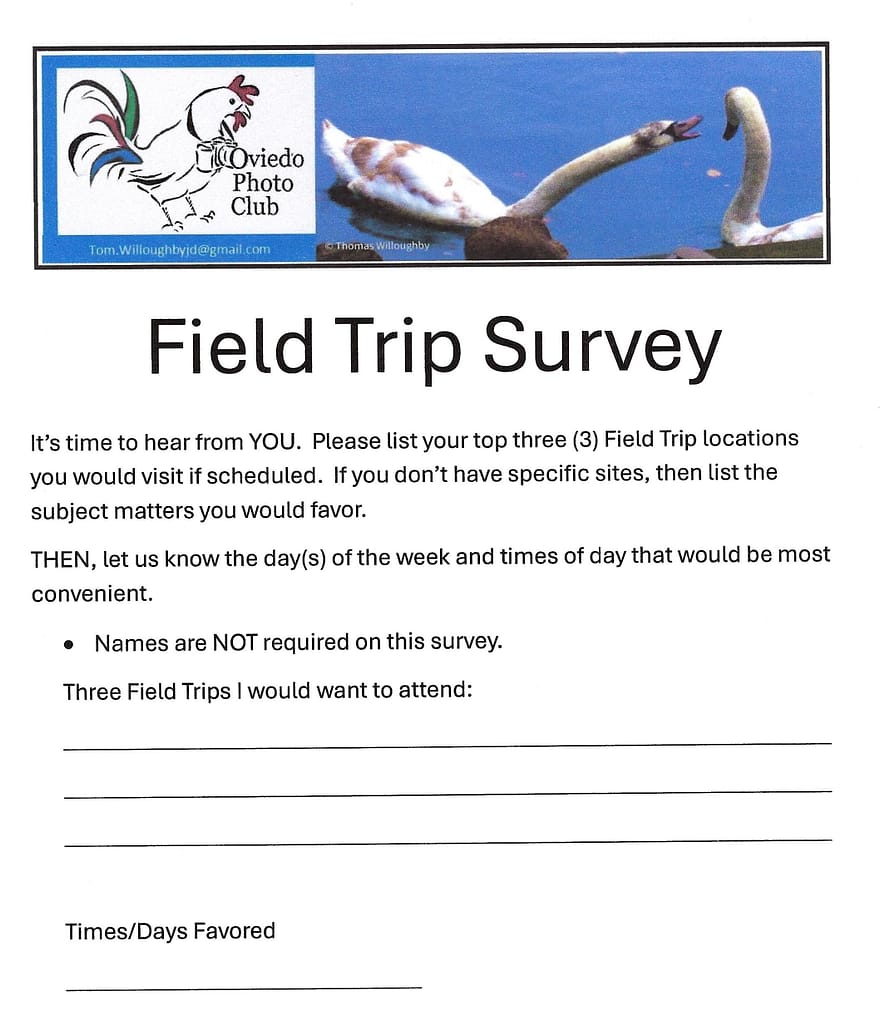 So… we need your help. Please download and complete the survey below. Bring it to the meeting Monday or – if you can’t make it to the meeting – email it back to me. Please help us make Field Trips inviting to all.