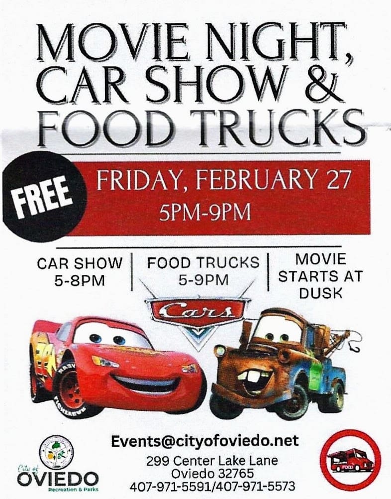 4 WHEN: Friday, Feb 27 at 5 PM. WHAT: Car Show (Part of Movie Night, showing “Cars”). WHERE: Center Lake Park. Please let me know if you will be there.