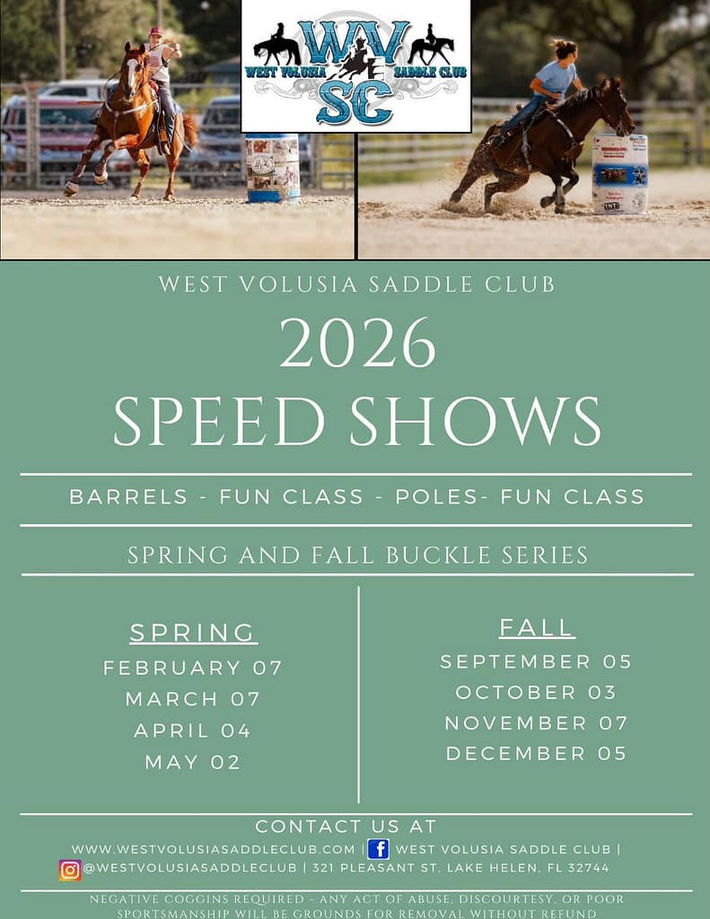 1. WHEN: Saturday, February 7 at 5 PM. WHAT: West Volusia County Saddle Club Speed Trials. WHERE: 321 Pleasant St, Lake Helen, FL