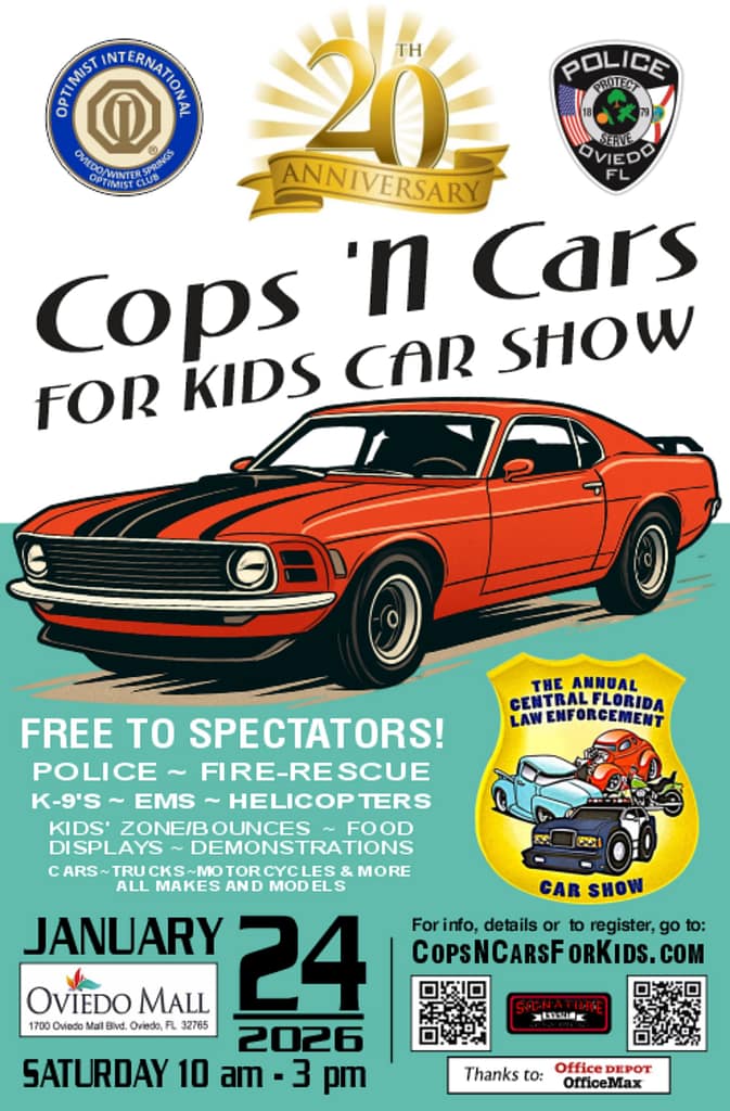 January 24: Cops ‘n Cars for Kids Car Show @ Oviedo Mall from 10 AM to 3 PM, sponsored by Optimist International & Oviedo Police.