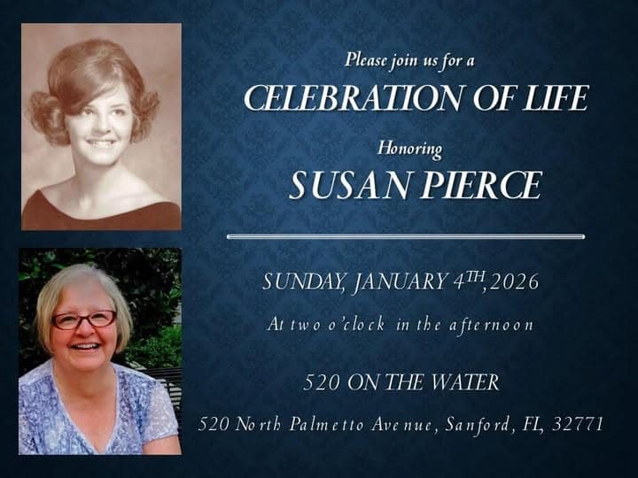 Sunday, January 4: Susan Pierce’s Celebration of Life. At 520 On the Water, 520 N. Palmetto, Sanford by the Marina, at 2 PM.