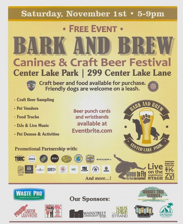 2. Oviedo’s Bark N Brew is Nov 1 from 5 to 9 PM.. Add that to your calendar